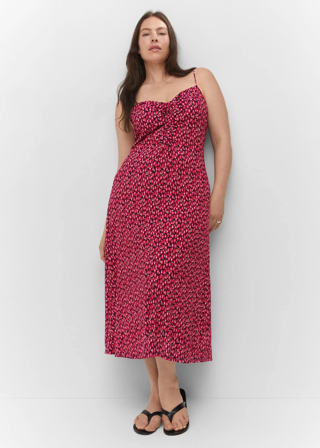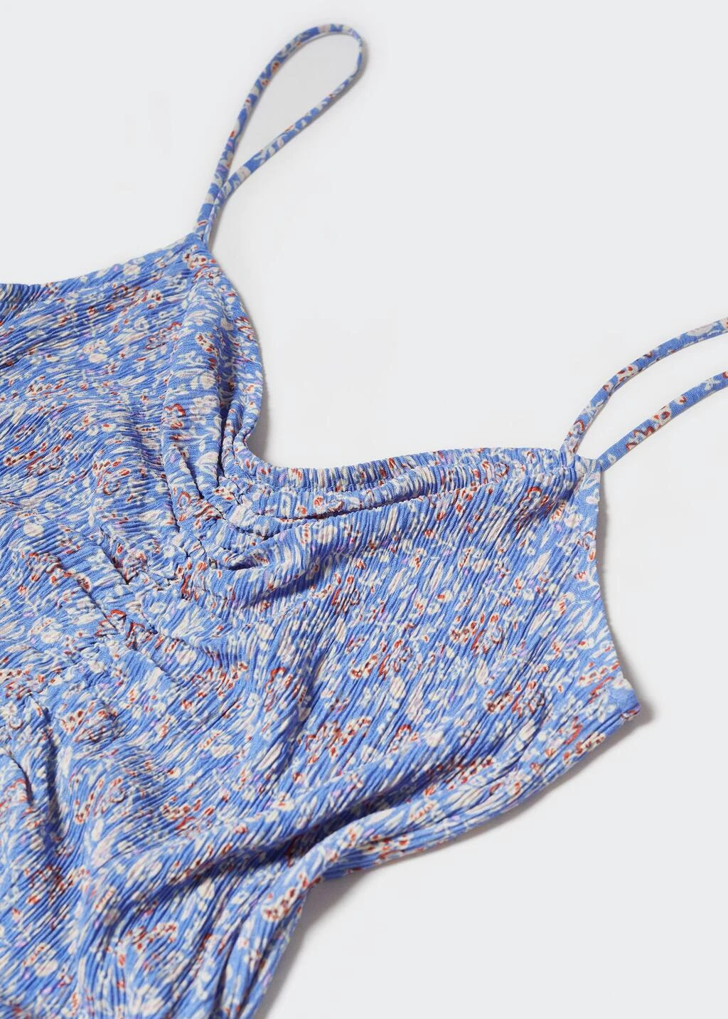 tissu fluide, tissu texture, coupe droite, coupe longue, motif floral, col echancre, bretelles fines, sans fermeture, detail fronceComposition: 100% polyester