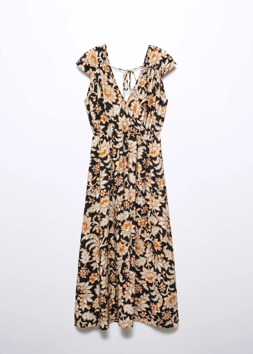 tissu fluide, croise, motif floral, coupe longue, col en v, manches courtes, decollete en v dans le dos, lien a nouer au dos, taille elastiqueeComposition: 84% viscose,16% polyamide