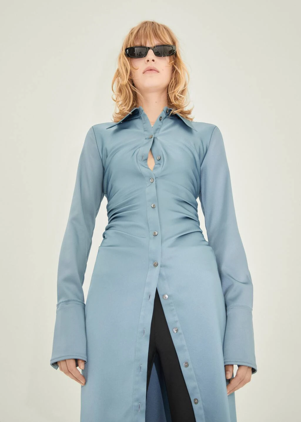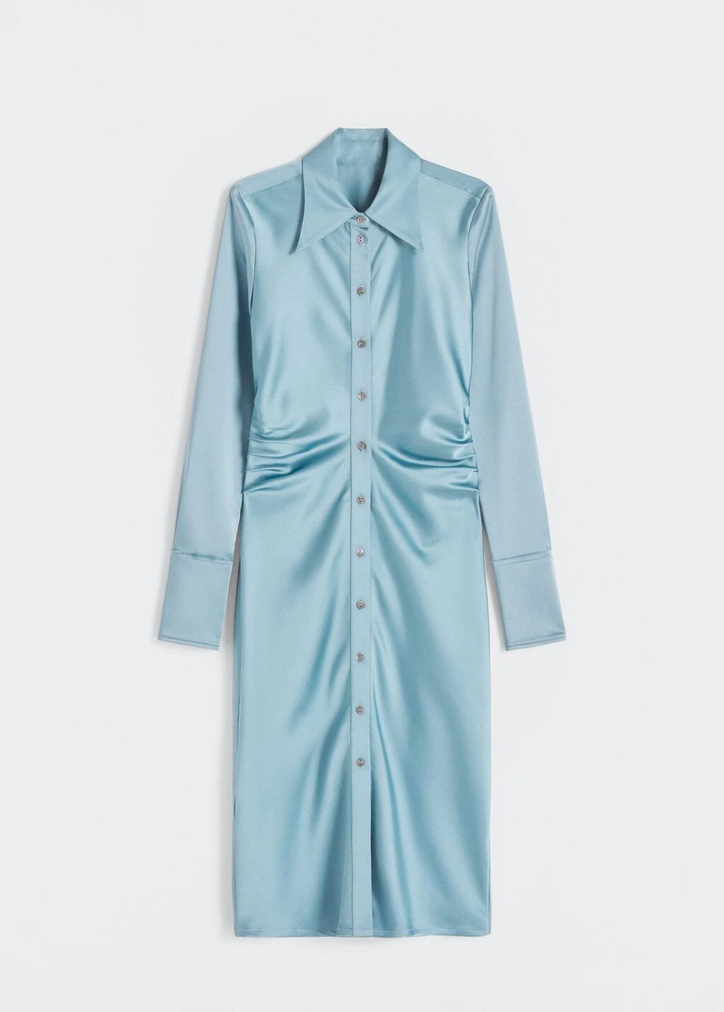 collection selection, tissu satine, tissu fluide, coupe midi, coupe cintree, col chemise, manches longues avec poignets boutonnes, fermeture a boutons sur le devant, une selection de pieces qui vous accompagneront lors du retour au bureau. confectionnee avec des matieres de qualite pour creer une garde-robe feminine et contemporaine pour votre quotidien.
