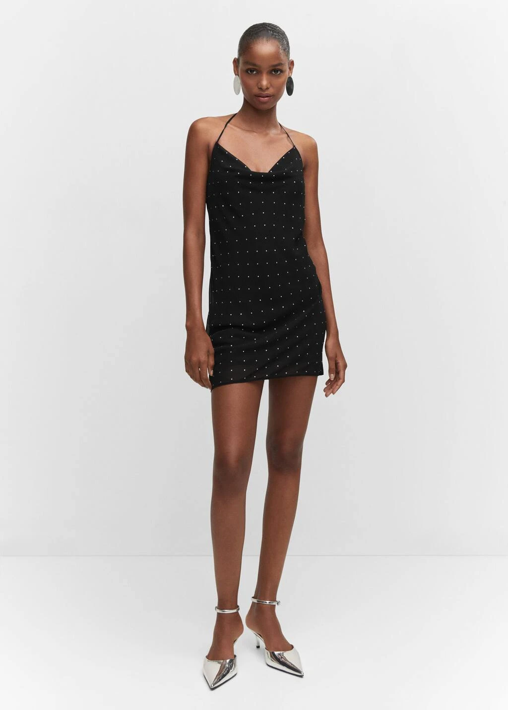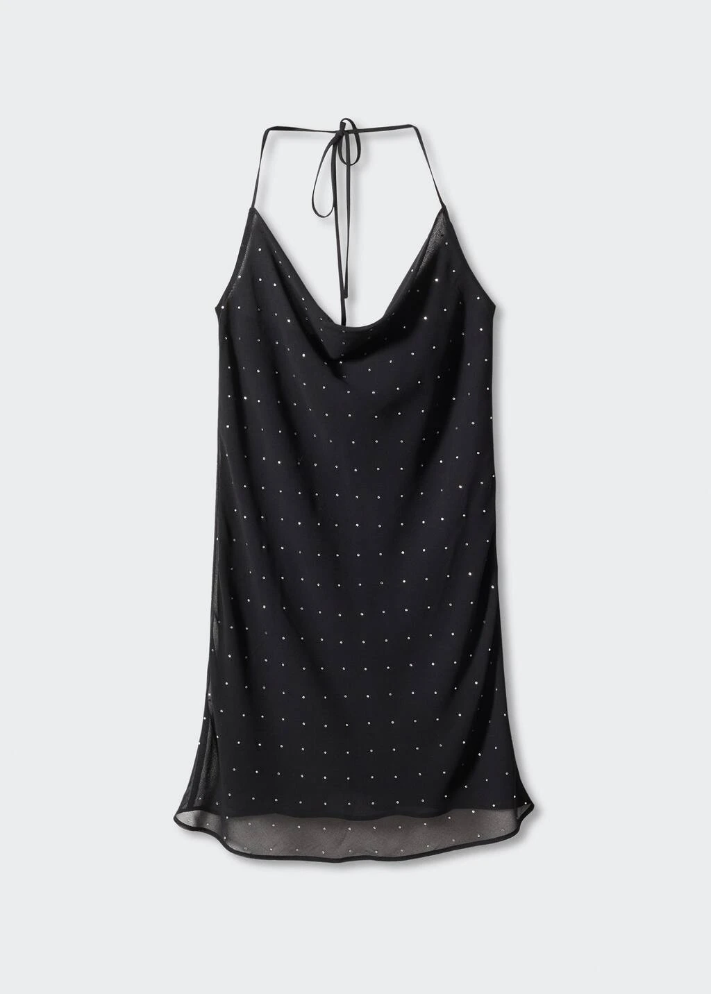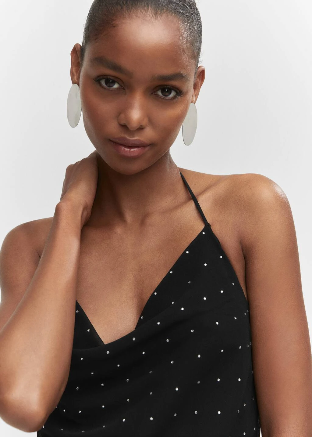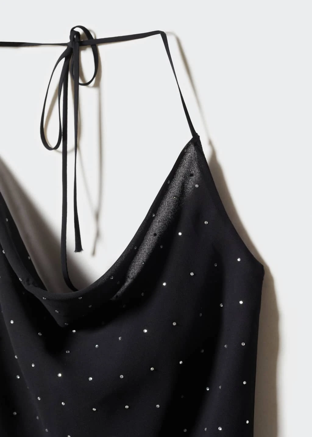 tissu fluide, droit, coupe courte, col drape, bretelles fines, lien a nouer autour du cou, sans manches, detail en strass, doublure, collection fetes et ceremoniesComposition: 100% polyester. Doublure: 100% polyester