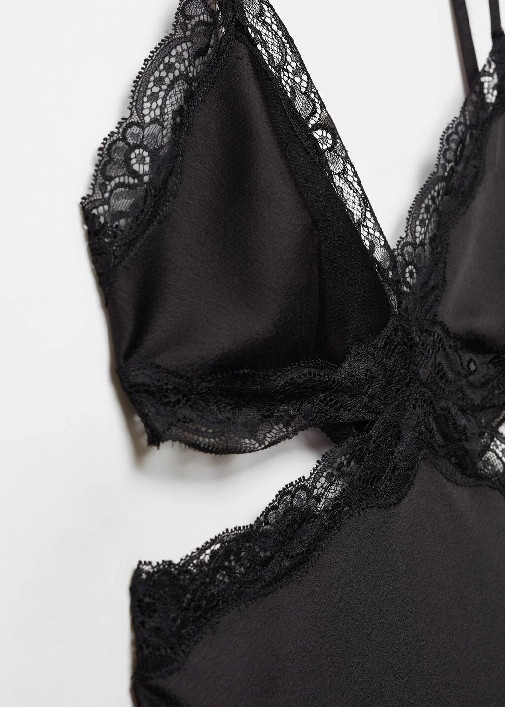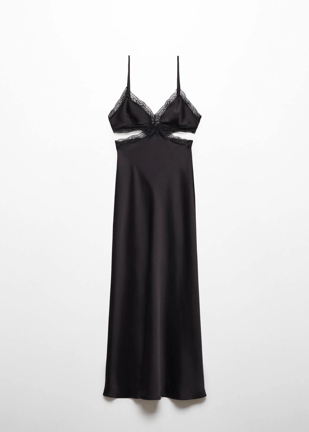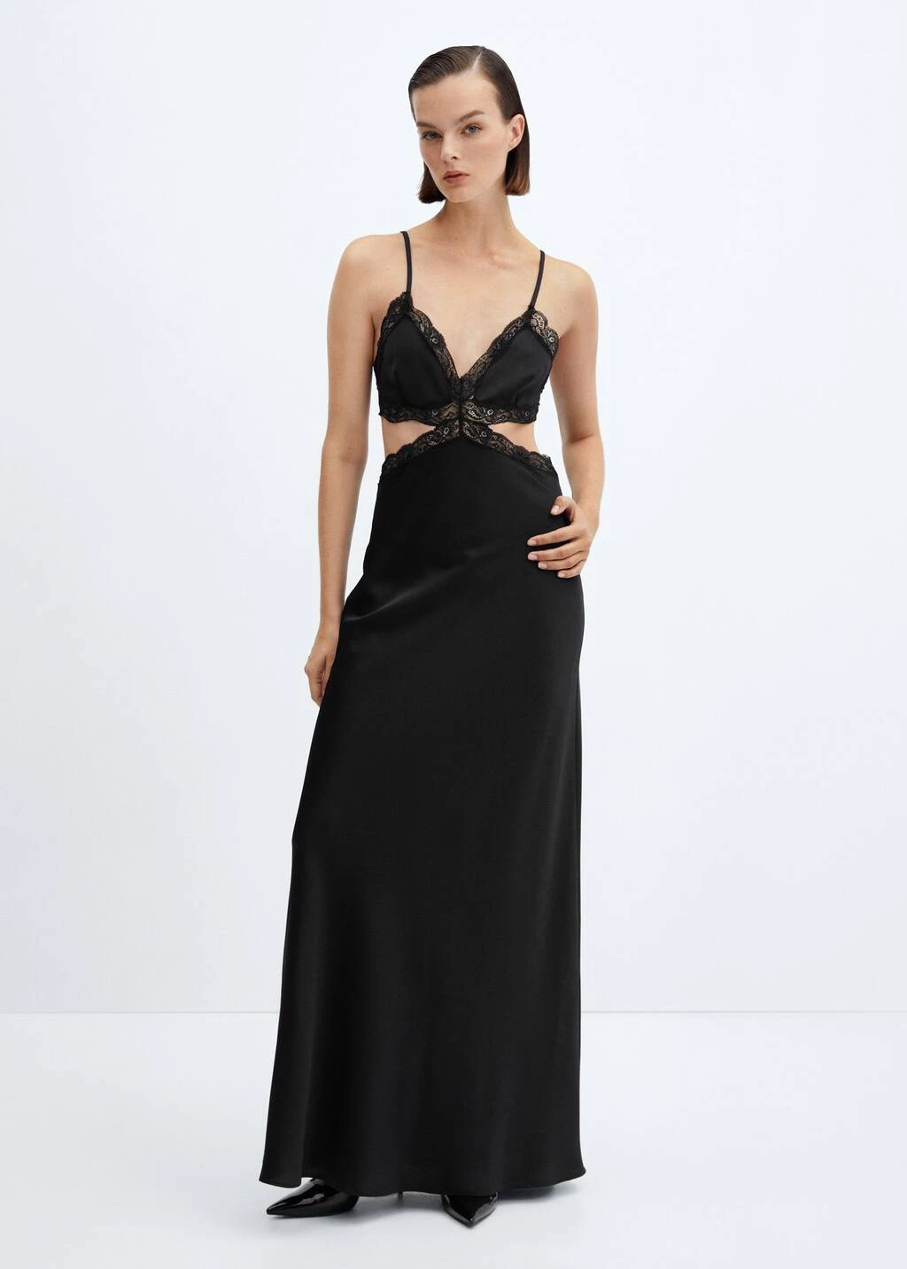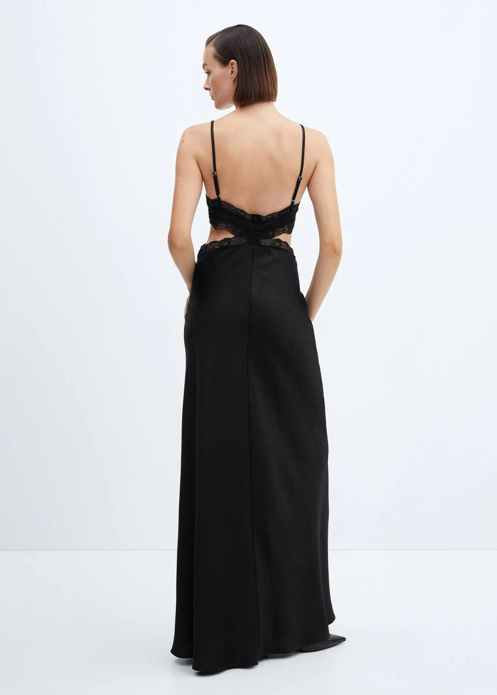 tissu fluide, tissu satine, coupe longue, coupe droite, col en v, bretelles fines ajustables, fermeture eclair invisible a l’arriere, fentes laterales, detail dentelle, collection fetes et ceremonies.Composition: 100% polyester. Lisiere: 100% polyester