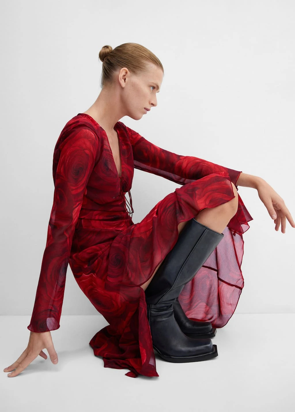 tissu fluide, tissu en gaze, coupe longue, imprime fleurs, col en v, col a nouer, manches longues, fentes lateralesComposition: 100% polyester