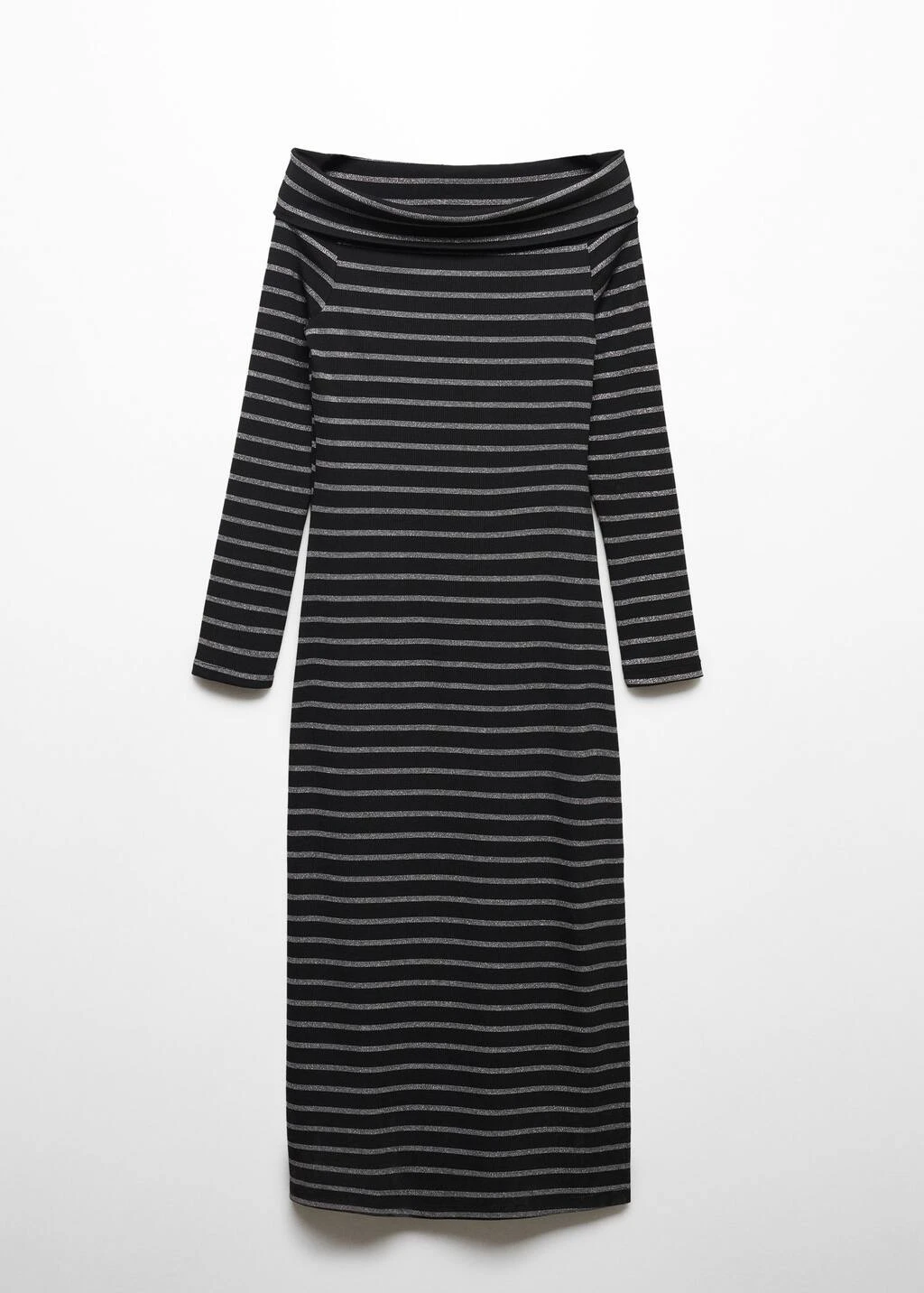 design epaules denudees, imprime rayures, epaules denudees, detail brillant, coupe droite, coupe midi, fente laterale, manches longues, sans fermeture.Composition: 69% polyester,22% viscose,6% elasthanne,3% polyester avec revêtement de cuivre