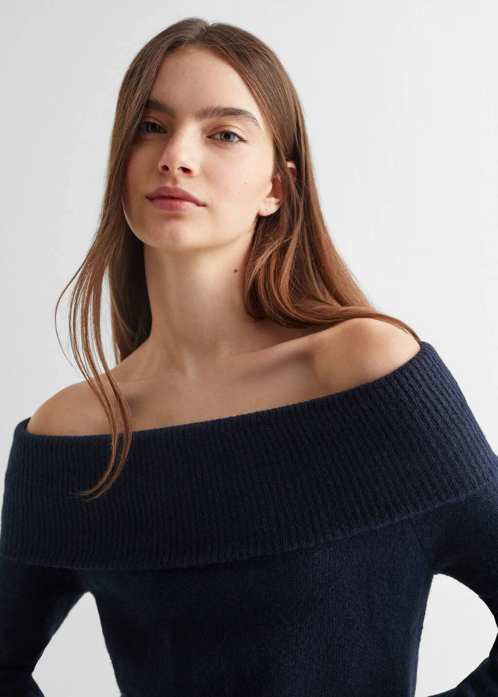 tissu en maille, epaules denudees, coupe droite, coupe courte, manches longues, sans fermeture.Composition: 54% acrylique,43% polyester,3% elasthanne