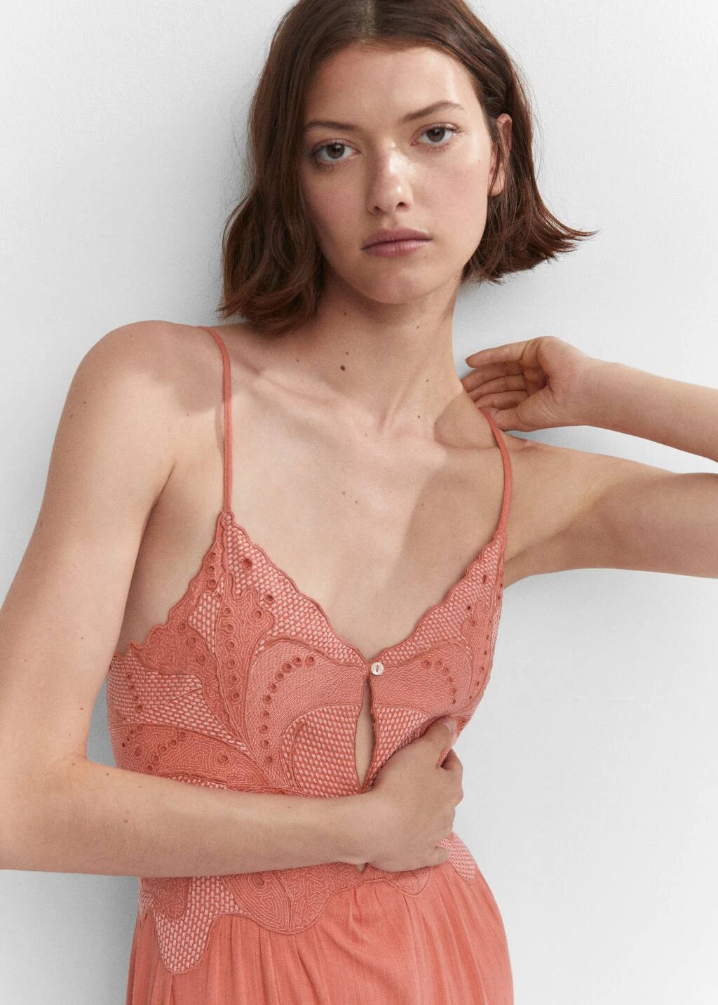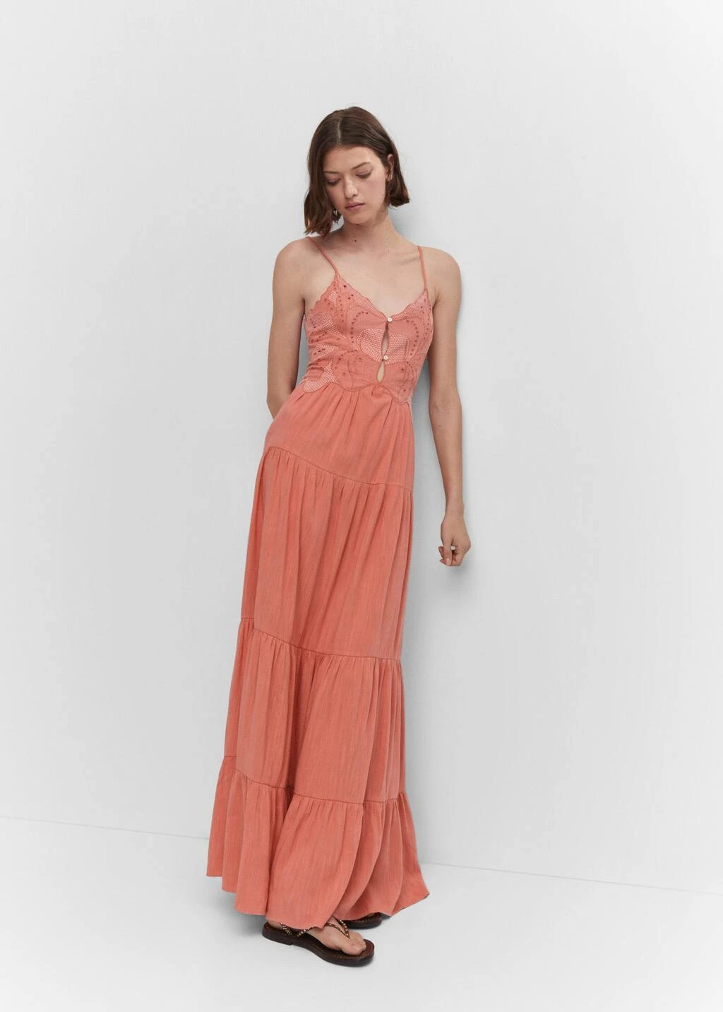 tissu de coton melange, tissu texture, coupe droite, coupe longue, col echancre, bretelles fines, dos nu, lien a nouer au dos, fermeture a bouton sur le devant, bas evase, details brodesComposition: 60% coton,40% viscose. Doublure: 100% coton. Broderie: 100% polyester
