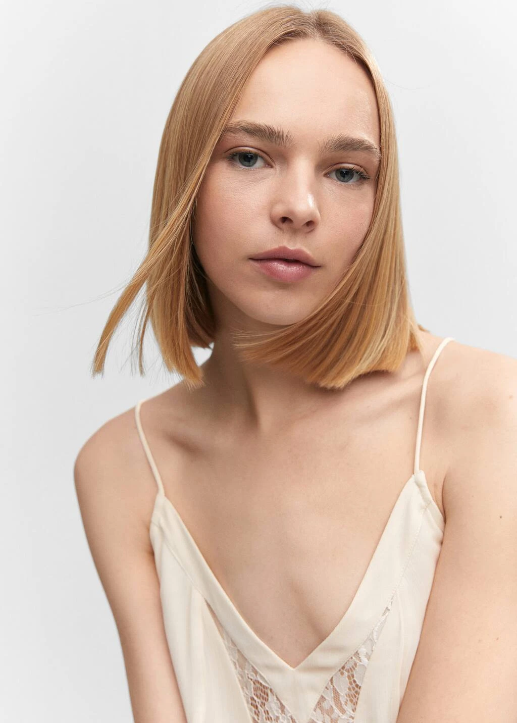 tissu fluide, style lingerie, droit, coupe courte, col en v, bretelles fines, decollete en v dans le dos, detail dentelle, bas evase, style bohoComposition: 100% polyester. Doublure: 100% polyester. Dentelle: 100% polyamide