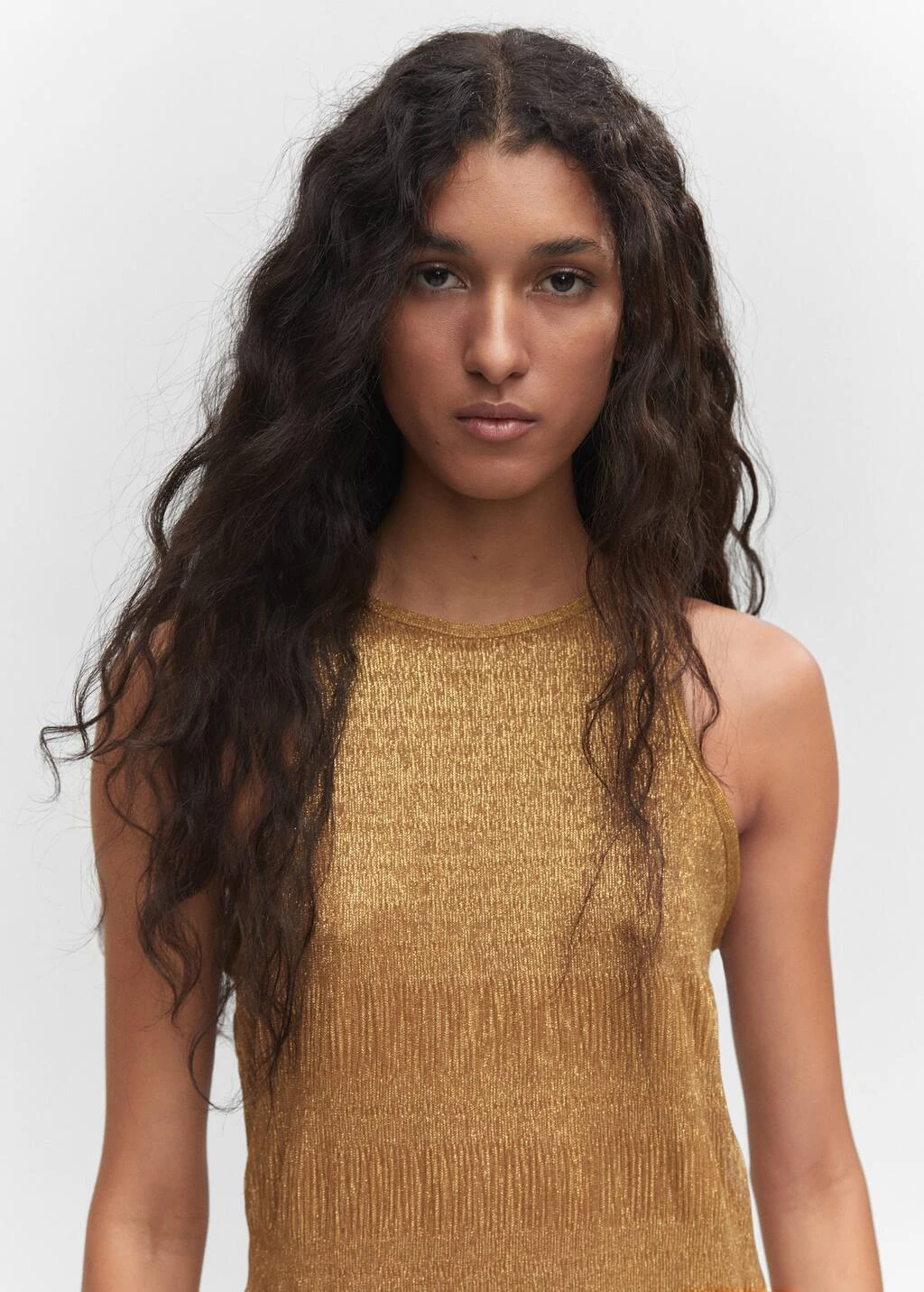 tissu lurex, coupe cintree, coupe midi, emmanchures americaines, sans manches, sans fermeture, details fronces, doublure, collection fetes et ceremoniesComposition: 40% polyester recyclé,34% polyester avec revêtement de cuivre,26% polyester. Doublure: 60% polyester,40% polyester recyclé