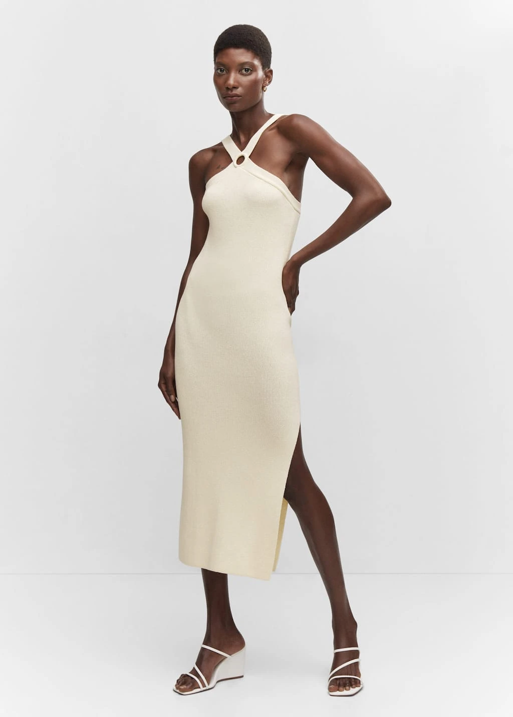 tissu en maille, ajuste, coupe midi, emmanchures americaines, bretelles larges, sans manches, sans fermeture, detail anneau, fente lateraleComposition: 68% coton,32% polyamide