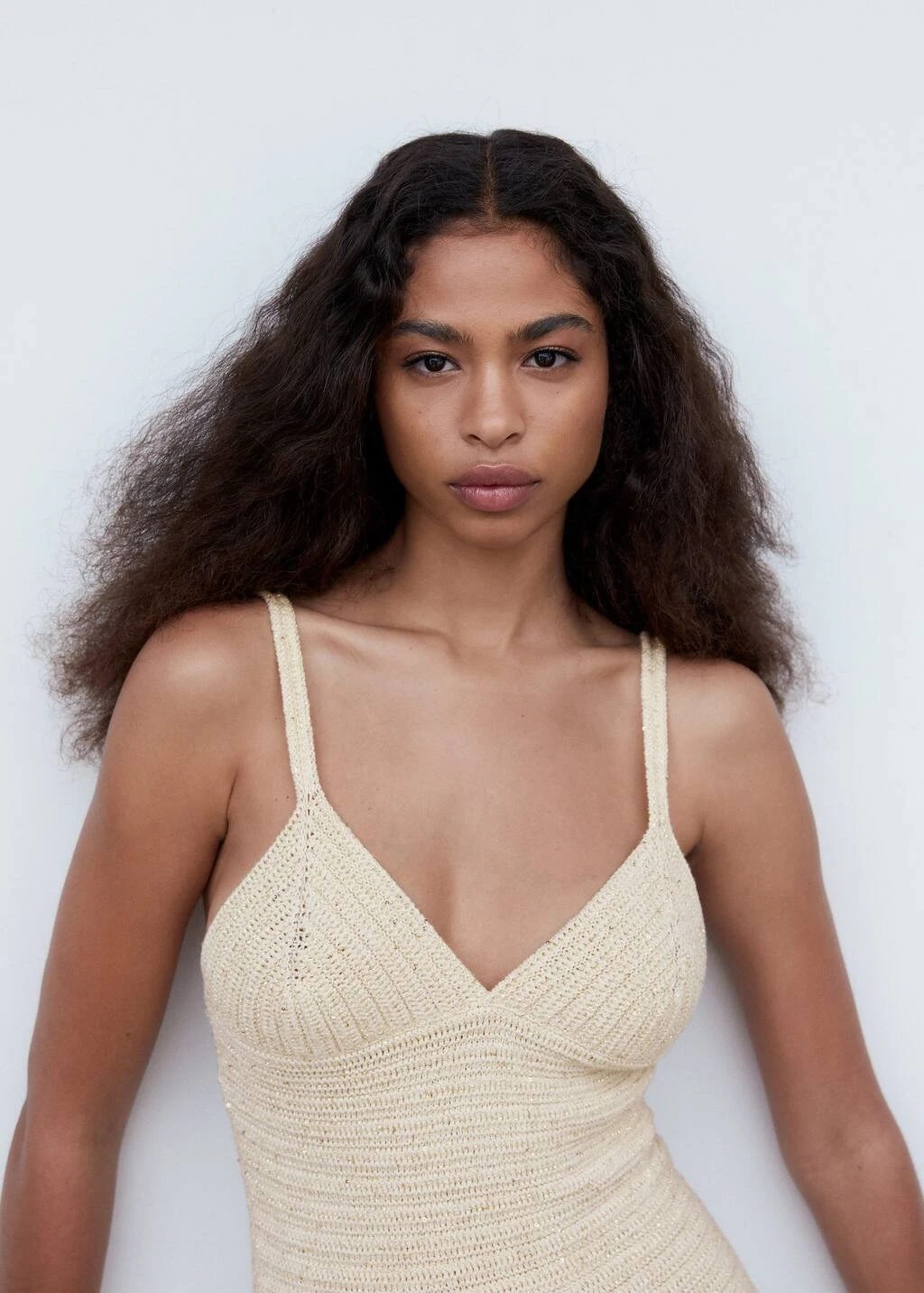 tissu en maille, coupe cintree, coupe midi, col en v, bretelles fines, encolure au dos, detail en sequins, collection fetes et ceremonies, collection selection, une selection de pieces raffinees, fabriquees a partir de materiaux de qualite pour creer une garde-robe feminine et contemporaine pour les grandes occasionsComposition: 38% acrylique,34% coton,23% polyester,5% polyester avec revêtement de cuivre