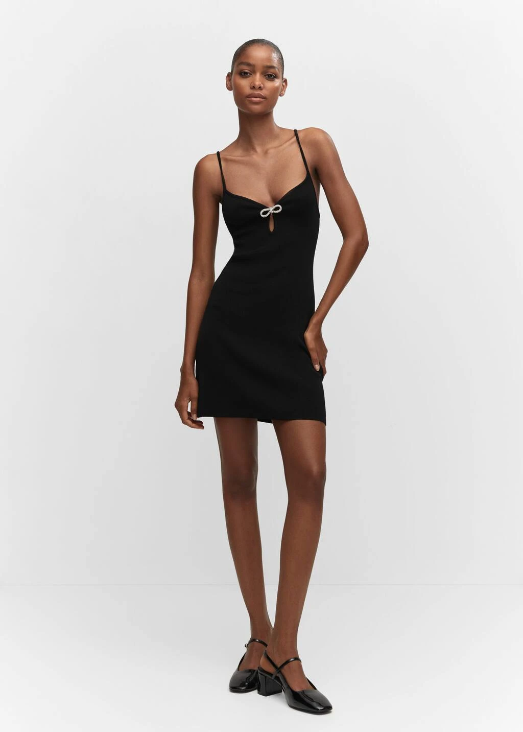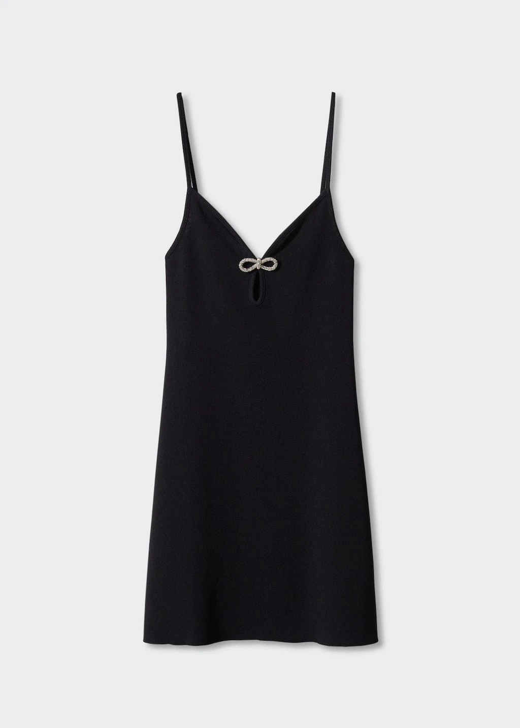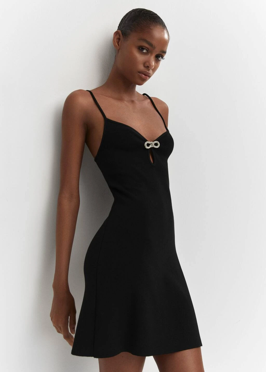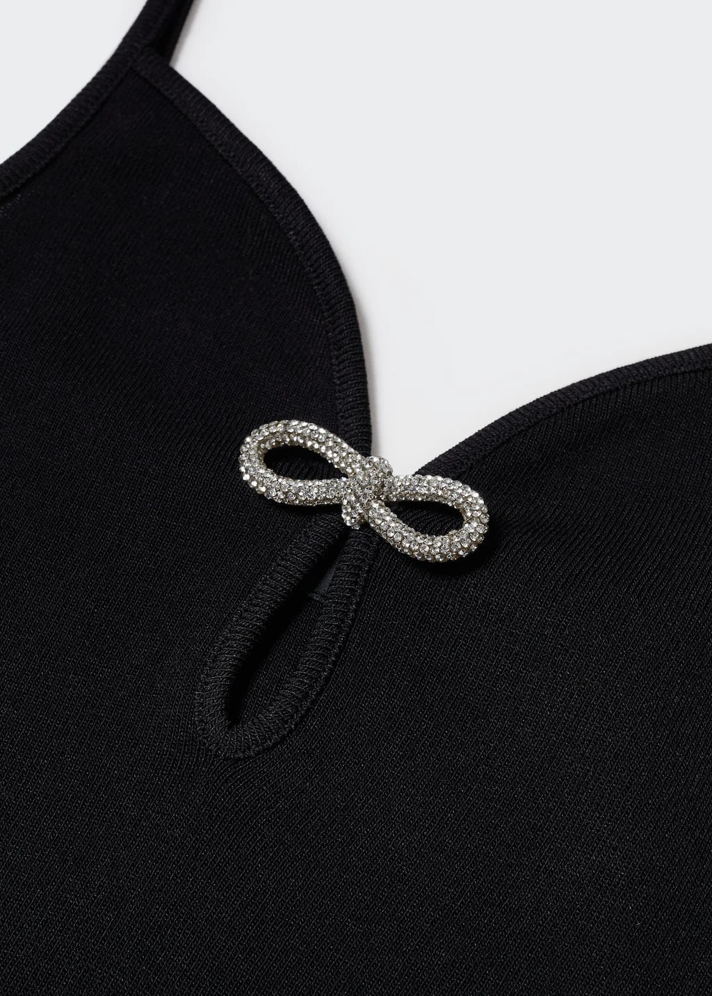 tissu en maille fine, coupe cintree, coupe courte, encolure en cœur, bretelles fines, encolure au dos, sans fermeture, detail en strass, collection fetes et ceremoniesComposition: 61% polyamide,39% viscose