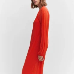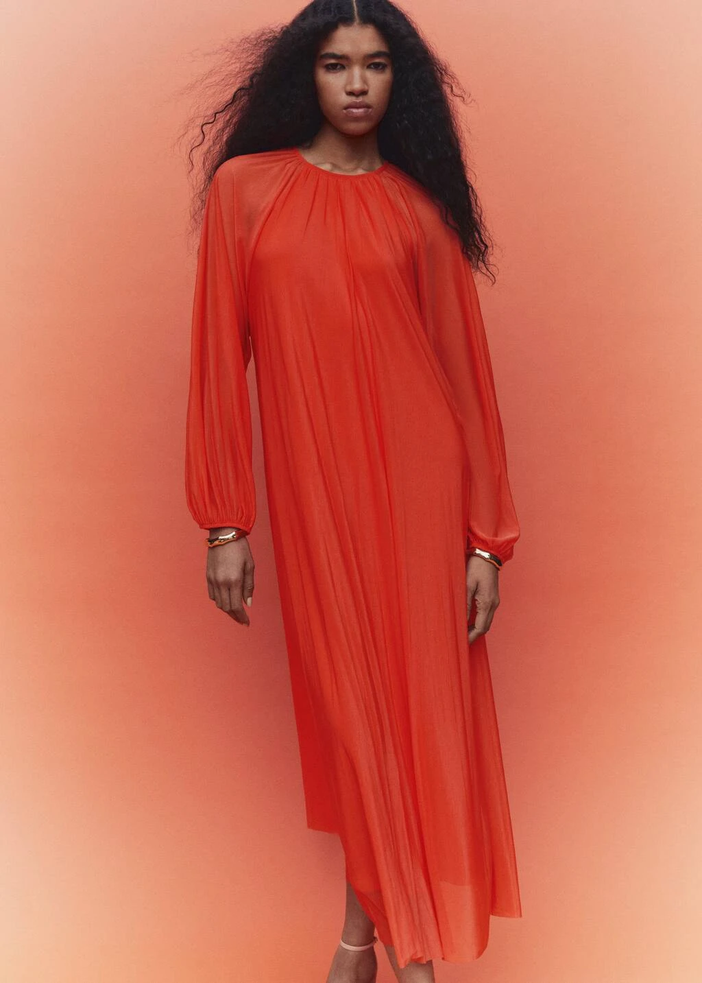 tissu fluide, tissu en gaze, coupe droite, coupe longue, col rond, manches longues bouffantes, ouverture dans le dos avec bouton, doublure, collection fetes et ceremoniesComposition: 100% polyester. Doublure: 100% polyester recyclé