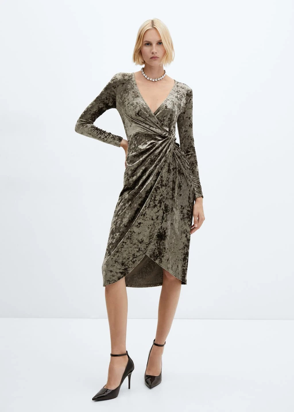 tissu en velours, coupe midi, croise, col en v, manches longues, sans fermeture, detail nœud, collection fetes et ceremonies.Composition: 95% polyester,5% elasthanne