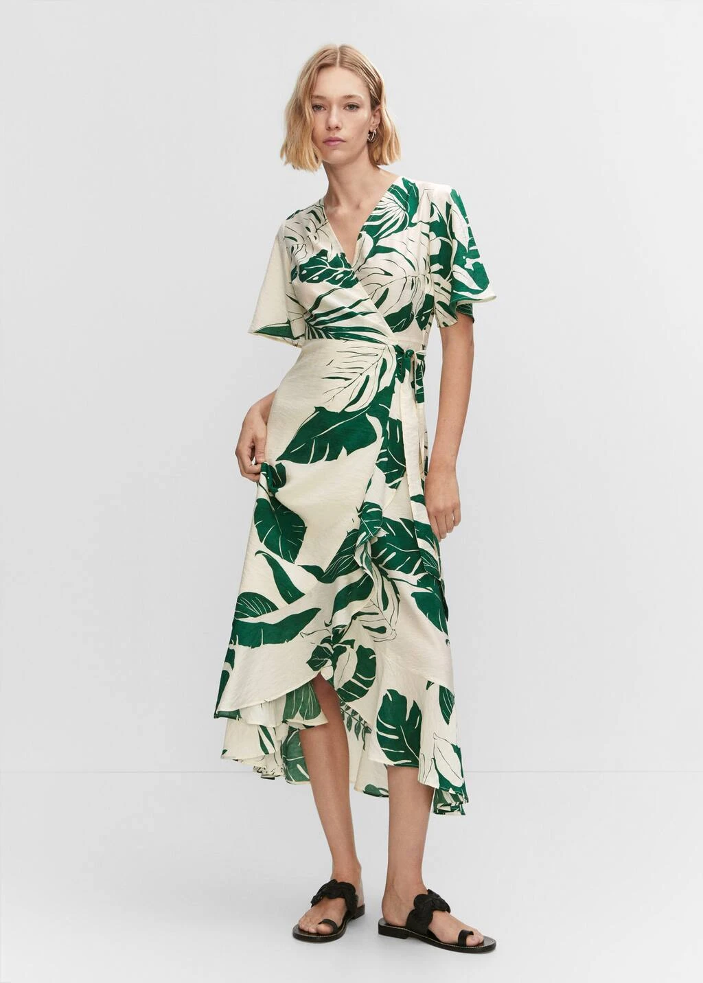 tissu fluide, imprime tropical, coupe midi, croise, evase, col cache-cœur en v, manches courtes, fermeture laterale a nœuds, disponible plusComposition: 83% viscose,17% polyamide