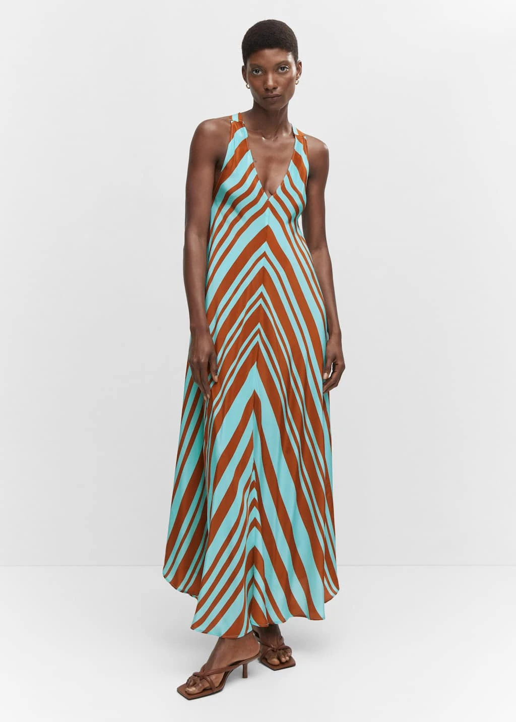 tissu satine, tissu fluide, imprime rayures, coupe longue, evase, col en v, bretelles larges croisees dans le dos, detail nœud, sans fermeture, collection fetes et ceremoniesComposition: 100% viscose