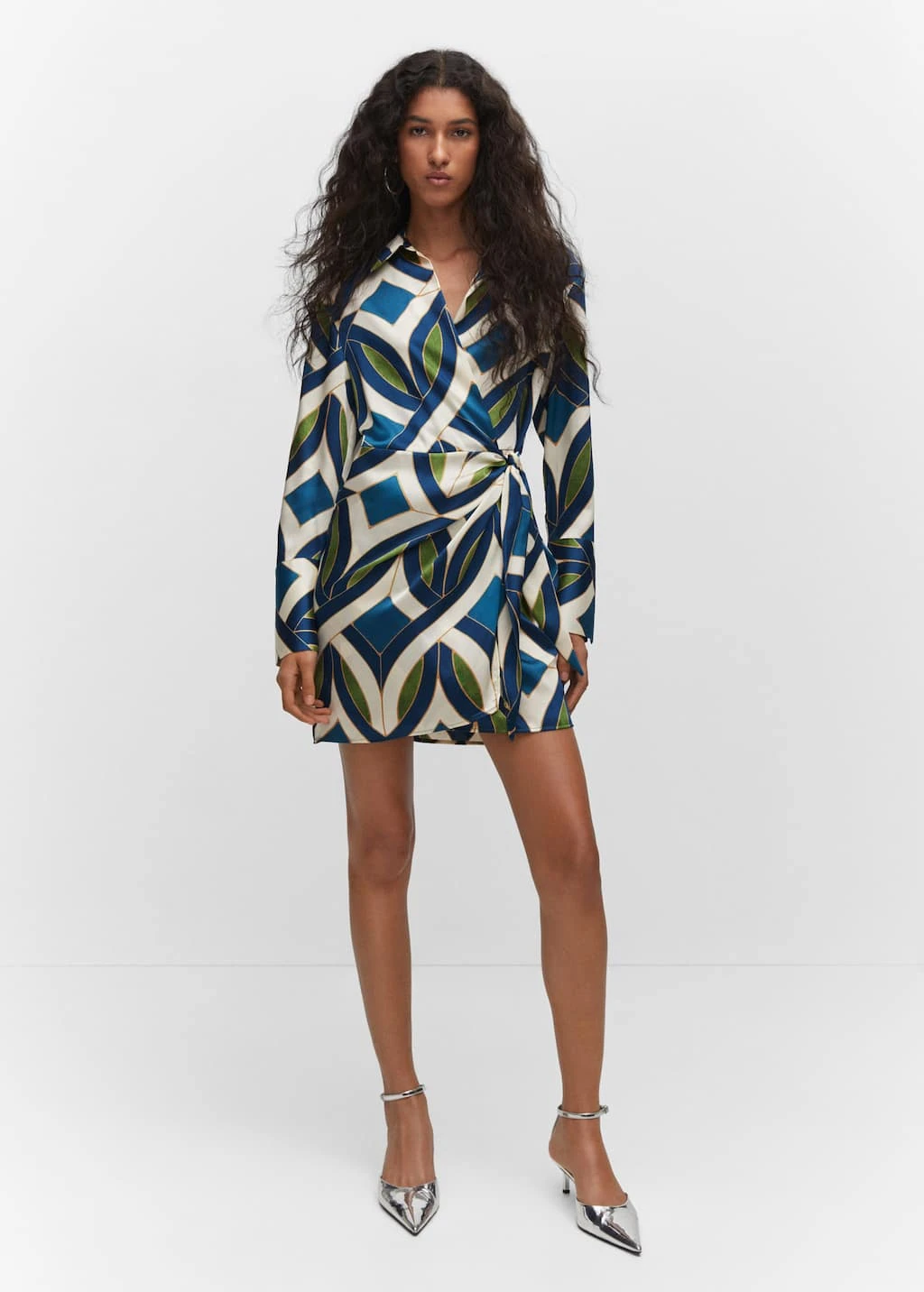tissu satine, tissu fluide, droit, coupe courte, imprime, col chemise, manches longues boutonnees, nœud a la tailleComposition: 100% polyester