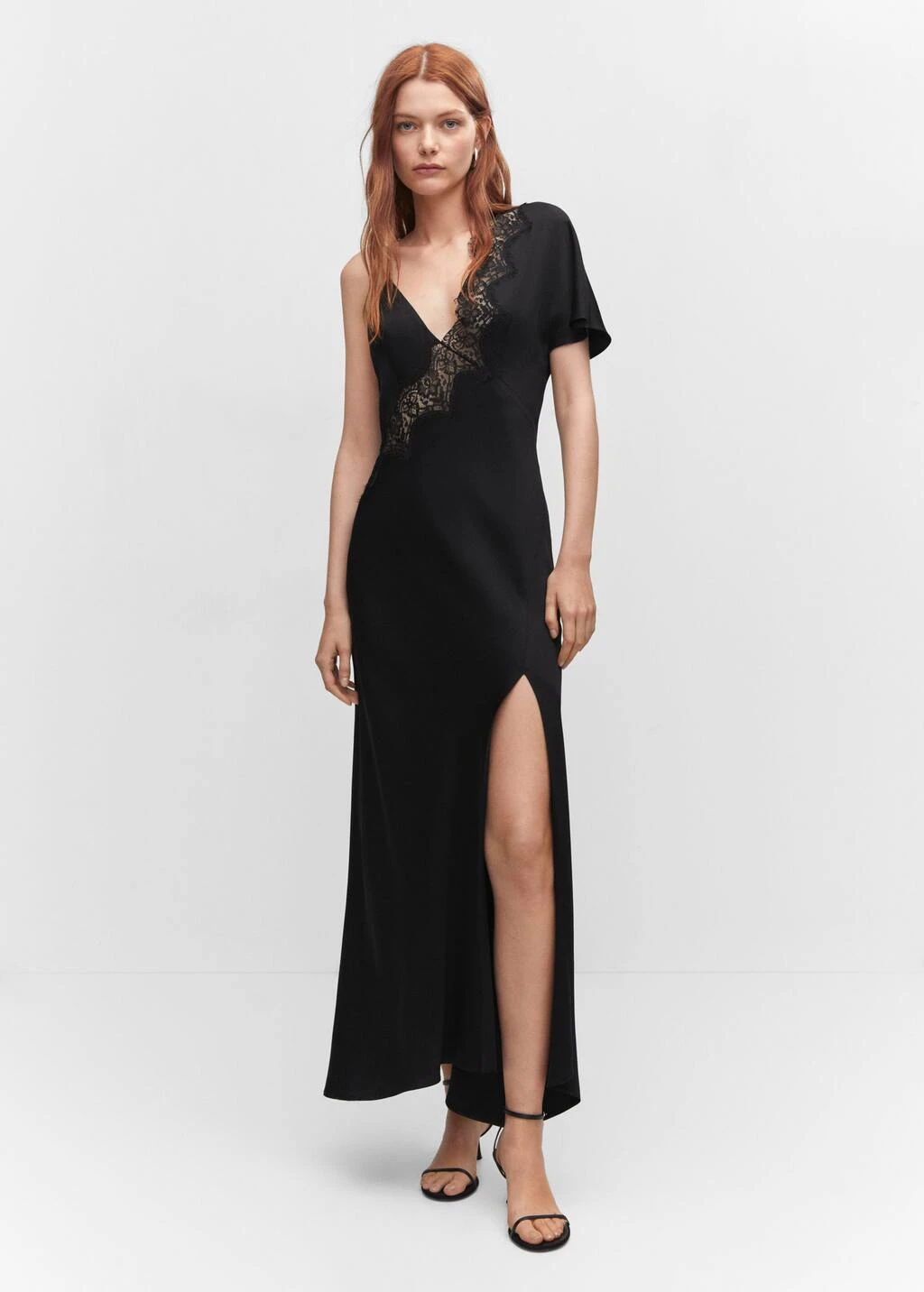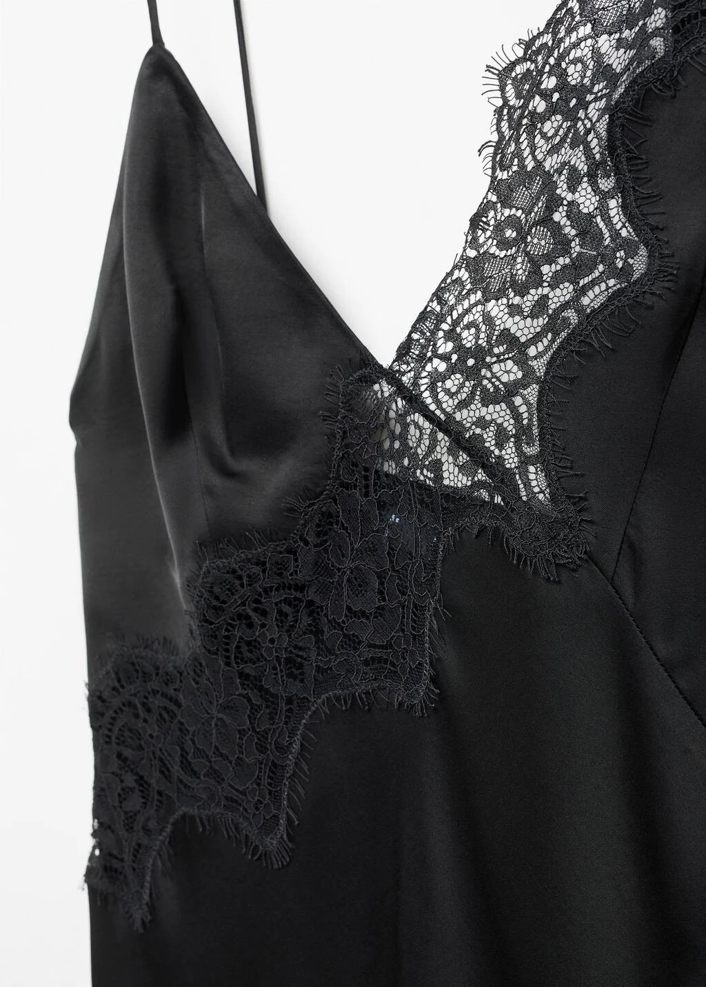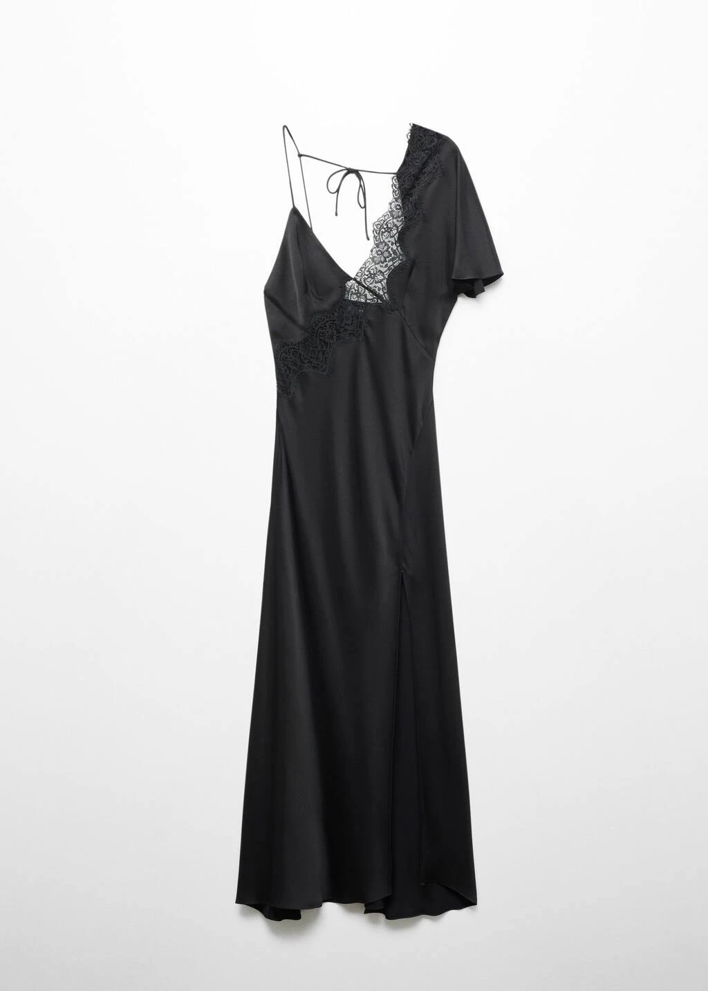 tissu satine, tissu fluide, style lingerie, coupe asymetrique, ajuste, coupe longue, col en v, bretelles fines, manches courtes, dos nu, detail dentelle, lien a nouer au dosComposition: 100% viscose. Dentelle: 100% polyamide. Lisiere: 100% viscose