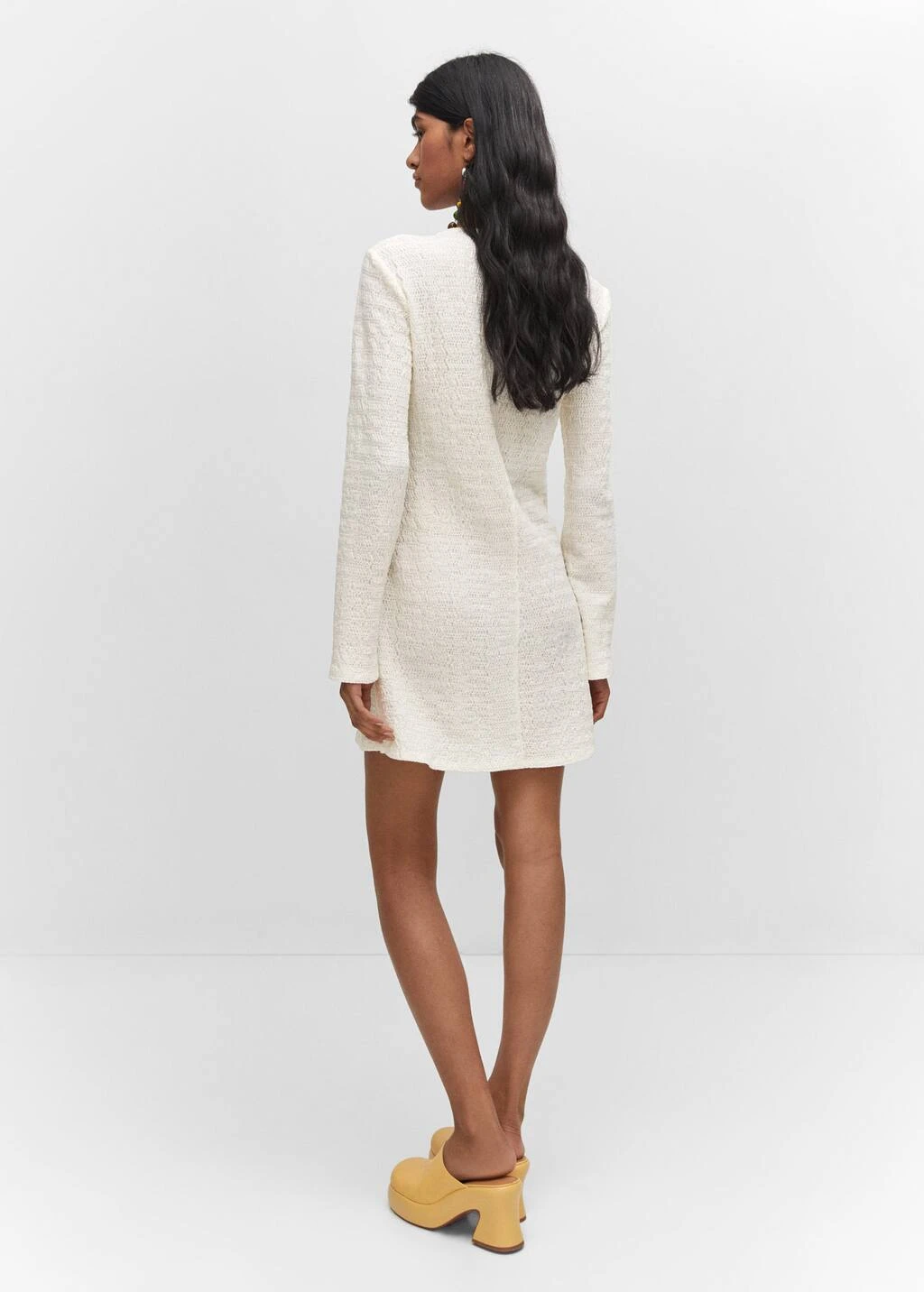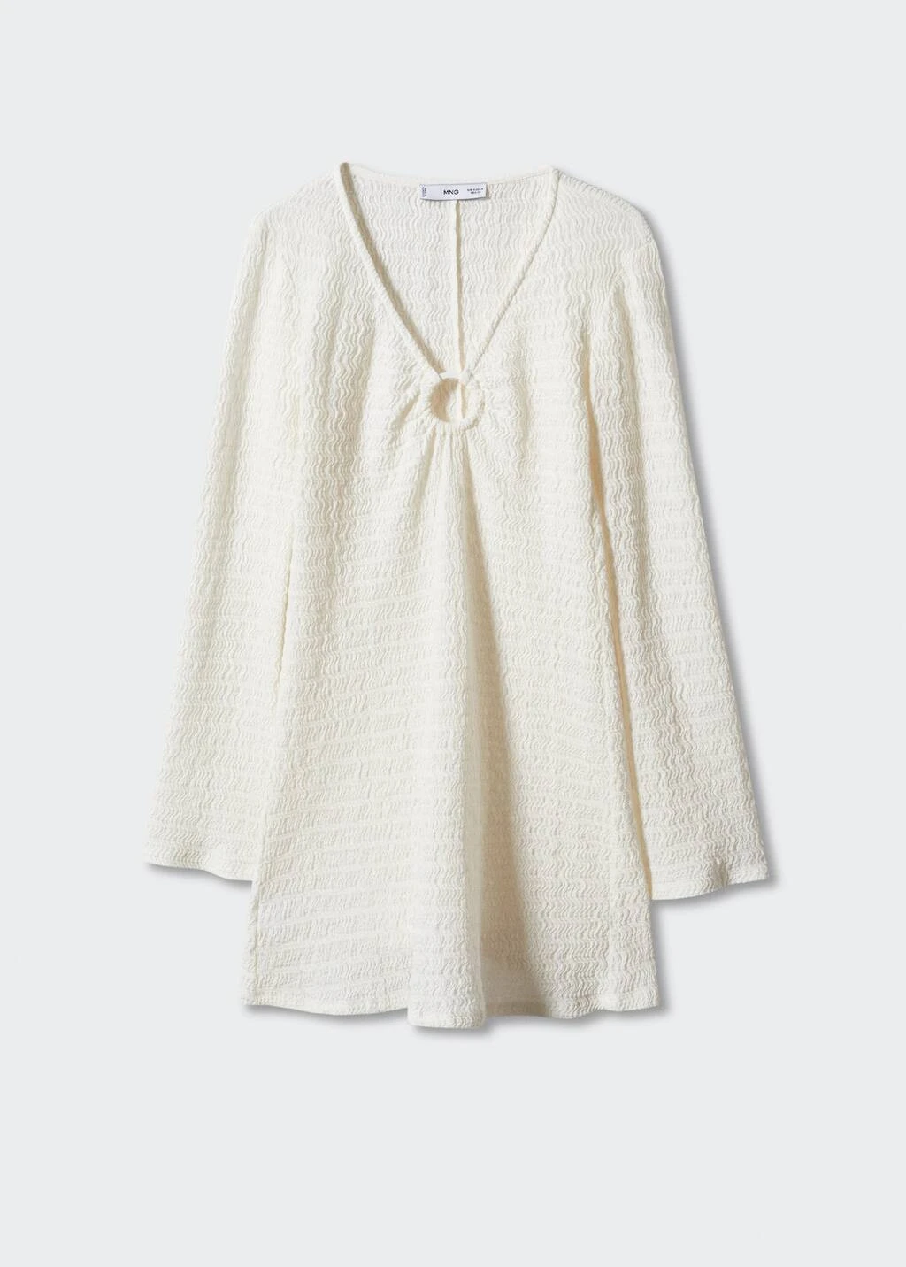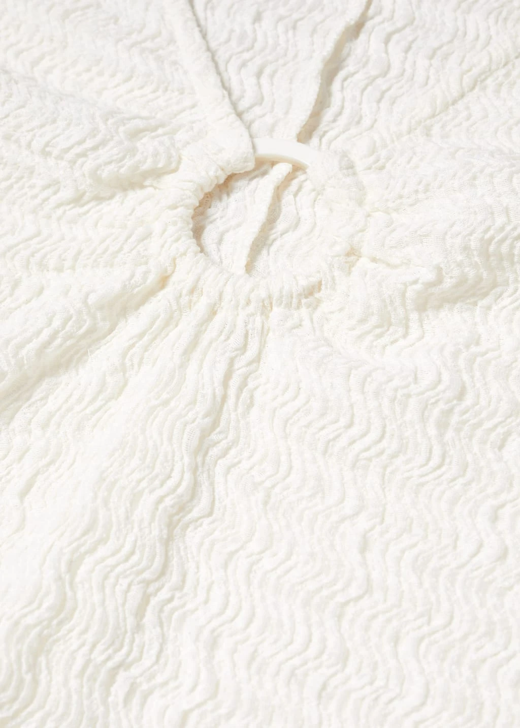 tissu texture, tissu de coton melange, coupe droite, coupe courte, modele semi-transparent, col en v, manches longues cloche, sans fermeture, anneau au niveau du decolleteComposition: 62% coton,37% polyester recyclé,1% elasthanne